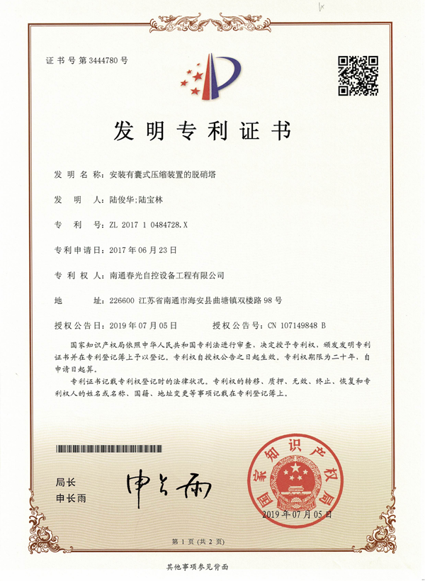 安裝有囊式壓縮裝置的脫銷塔專利證書
